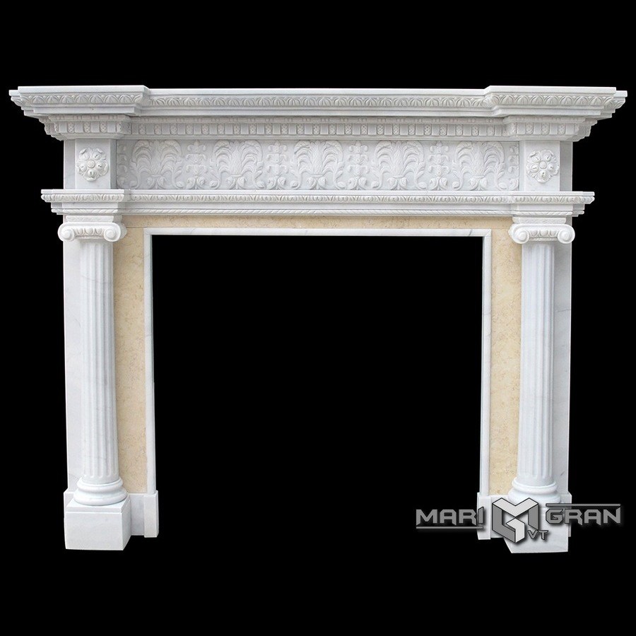 Камін AFINA виготовленний з матеріалу мрамор MILAS . В данному каміні виконано багато різьби, яка може бути запропанована для кожного клієнта індивідуально. Колонни каміну є пустотними і виготовляються з шести частин з ледь замітними стінками, оздобленні 8-10 канелюрами , а на капетеліях зроблена різьба у вигляді квітки. Шторки каміну виготовленні з мрамора BOTICHINO SEMICLASSICO. Кришка каміну виготовлена з відступами над колоннами, складається з п”яти частин .