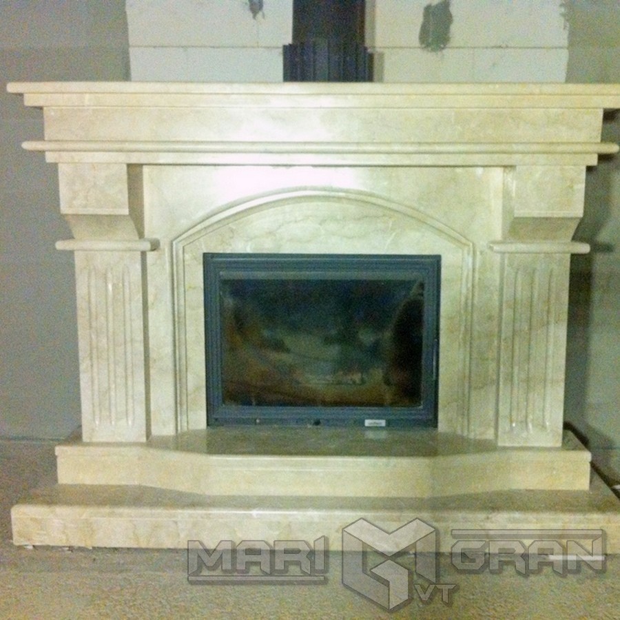 Камін “Мілан” зроблений з матеріалу мрамор BOTICHINO ROYAL . Масивні колонни з канелюрами і капетелії додають каміну величі. Посередині каміну розташована втоплена арка з подвійною фаскою. Внизу мраморного каміна розташований подвійний цоколь сходинками . Друга сходинка цоколю виготовлена об”ємною.