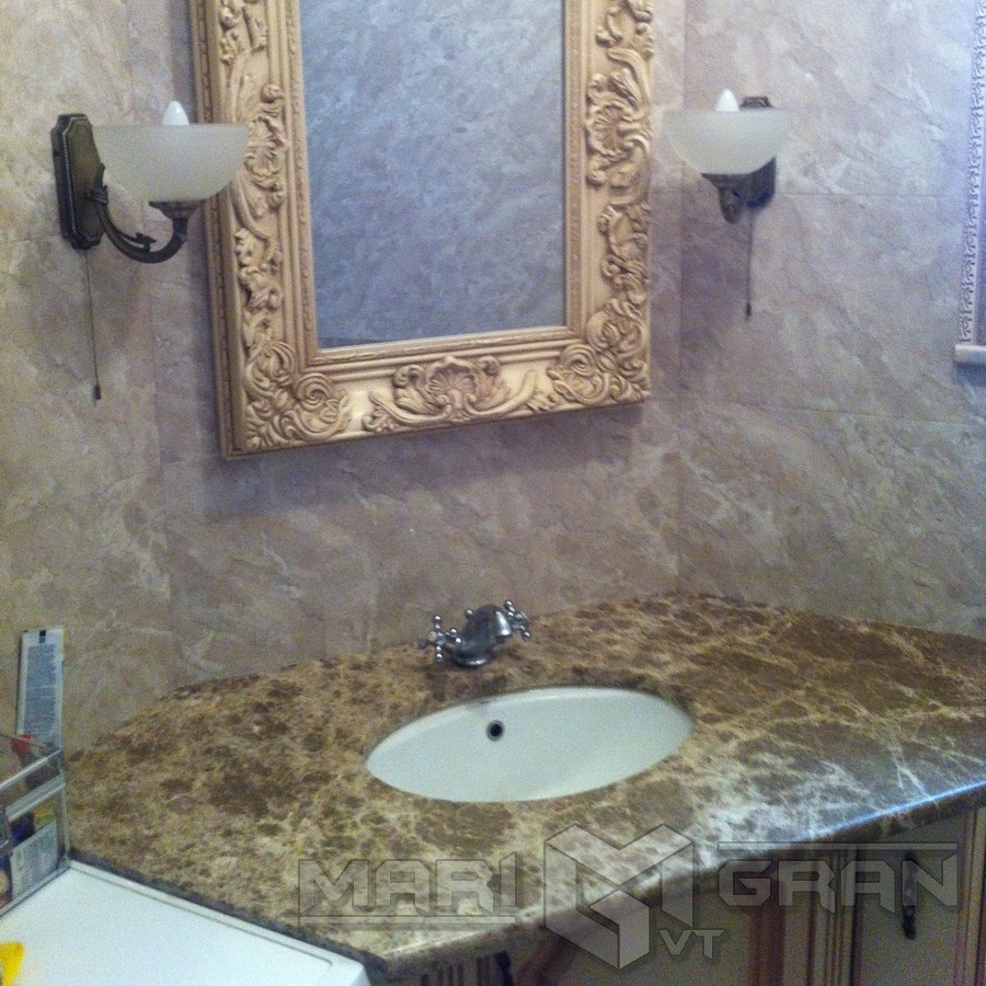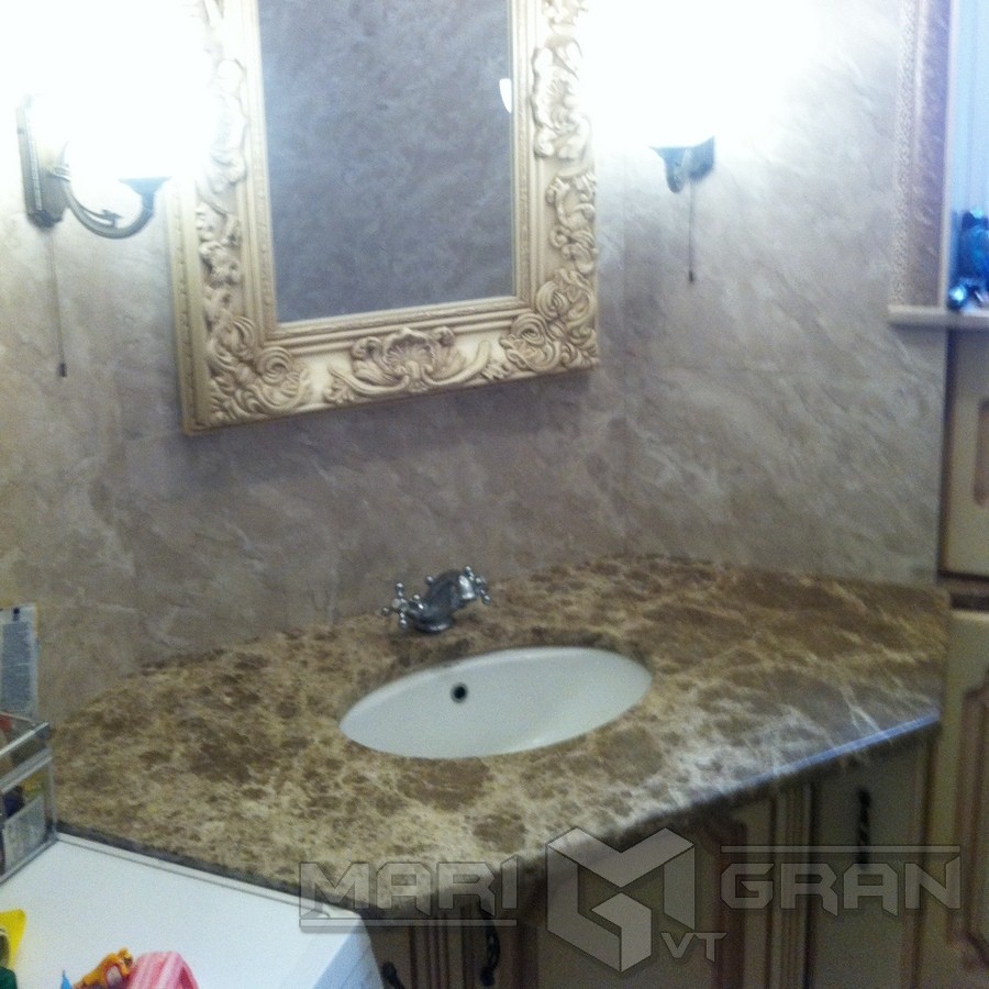 На фото ванна облицьована мраморною плиткою бежевого кольору. Використанная техніка поєднання світлого і темного бежевого мрамору. Для комфортного користування ванною знизу передбачено заглиблення .